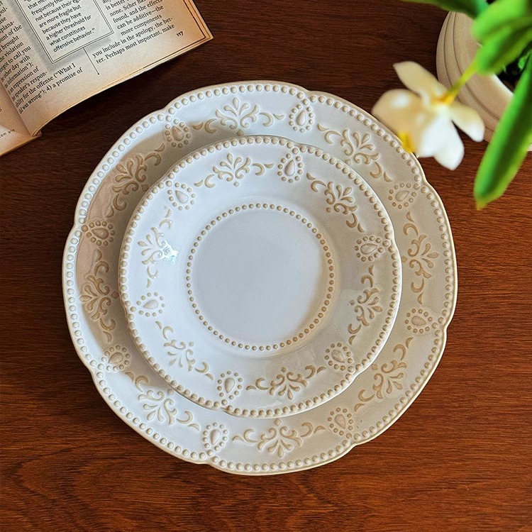 インズレトロスタイルのエンボスセラミックプレート、特に美しいステーキディナープレート、西洋ディナープレート、美しいプレート
