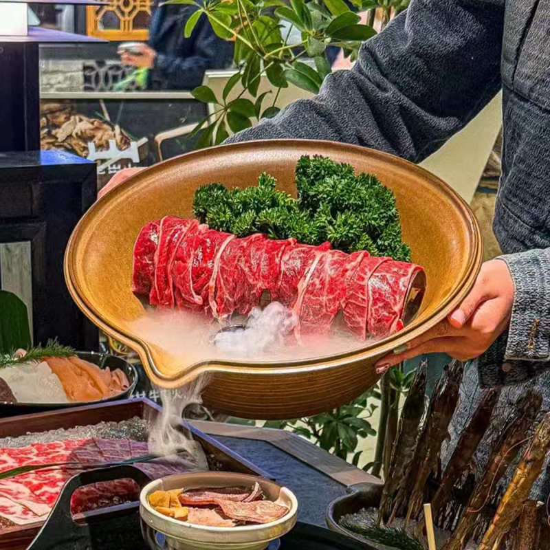 重慶老火鍋、懐かしい街頭屋台火鍋、生牛肉ビュッフェ、縁起の良い如意皿、創作火鍋食器
