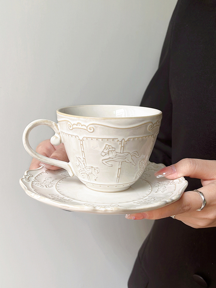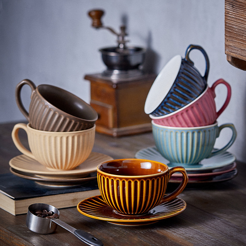 レトロ窯変フランス式レリーフ陶磁器コーヒーカップ皿アフタヌーンティーカップセットラテマグカップ