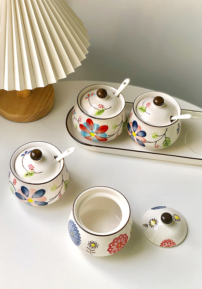 日本式陶磁器の塩缶の単独の油は辛辣な子の缶の豚の油の缶の台所の家庭用の蓋の調味料の缶の手描きをかけます。