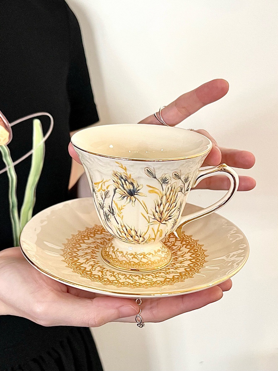 フランスのレトロな金麦穂の午後のお茶のコップのヴィンテージの中古のコーヒーのコップの皿の陶磁器のコップ