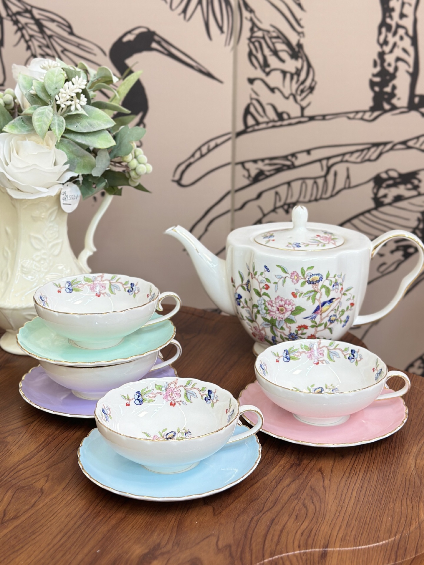 レトロな花の間の鳥の骨の磁器のコーヒーの杯の皿の午後のお茶の器のティーポットの花のお茶の杯の皿のヨーロッパ式の高い顔の値の杯