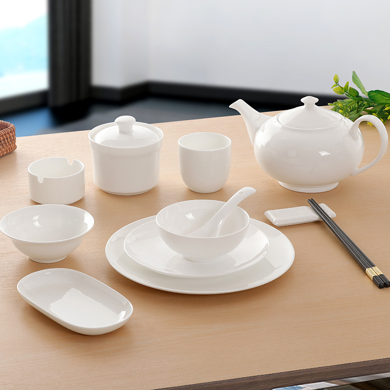 純白の骨磁器ホテルの単独の自由な組み合わせの食器のセットは台のホテルの陶磁器の碗の業務用の碗のスプーンを並べます。