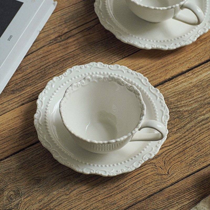 フレンチレリーフセラミックコーヒーカップとソーサーセットレトロアフタヌーンティーカップ家庭用ソリッドカラーラテカップ