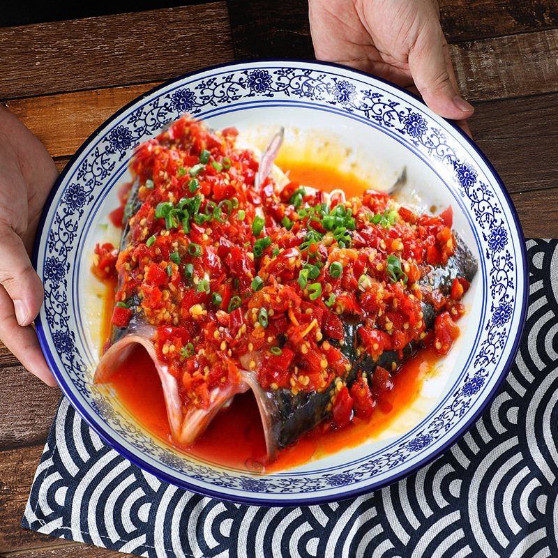 陶磁器の大きい皿の野菜の皿の家庭用蒸し魚の皿のアイデアは超特大サイズの青花のみじん切りの魚の頭の皿の丸い深い平たい皿です。