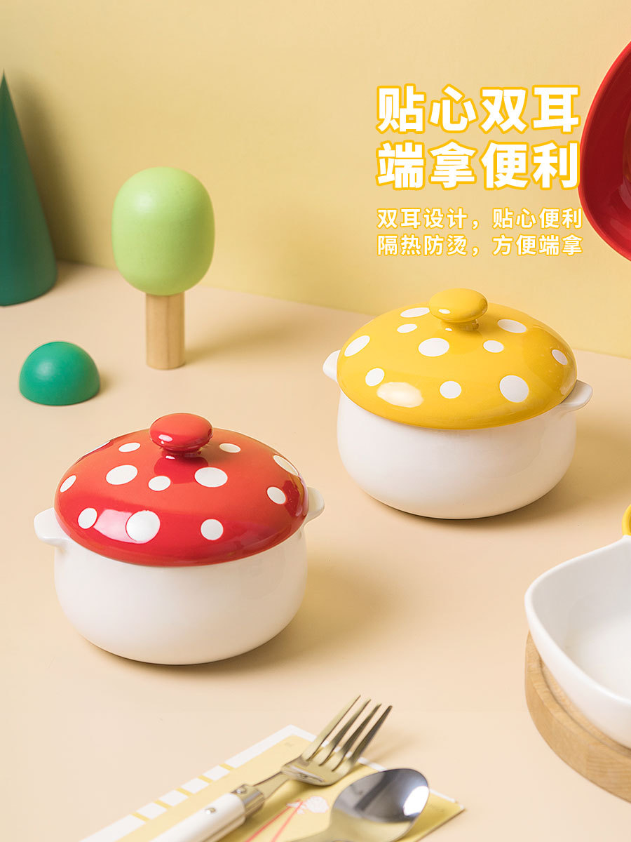 蒸し卵の碗の双耳のシチューの杯のかわいい蒸し卵の碗の高温に耐える碗の釉薬の下で彩の赤ちゃんの補助食品は蓋の碗を持ちます。