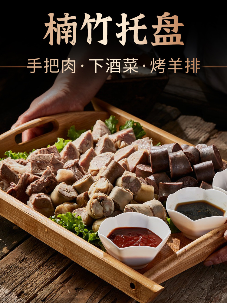 羊の列の皿の手は肉のつまみのトレーの木製の長方形を漬物につけます。