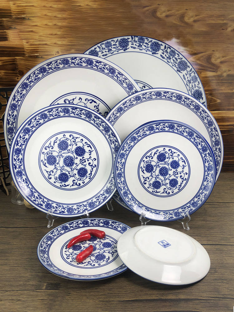陶磁器のホテルの熱い料理の前菜の皿の青と花の磁器の中国式の家庭用の円形の浅い皿のホテルの商用の食器