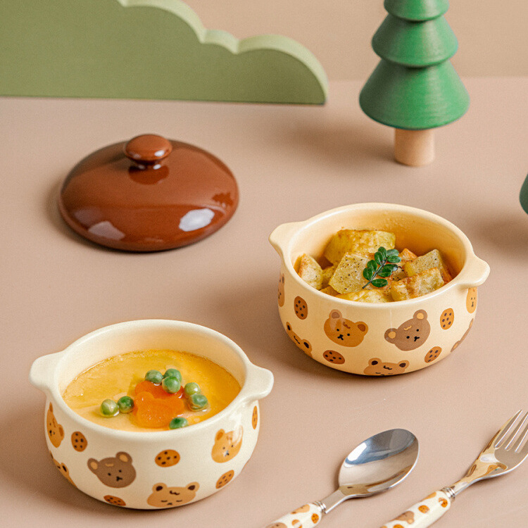 蒸し卵の碗のかわいい陶磁器のシチューの杯の双耳の小さい碗は蓋の碗の補助の碗を持って卵を蒸します。