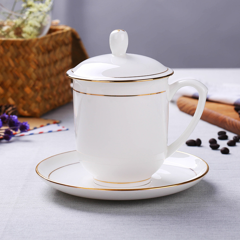 景徳鎮陶磁器カップ蓋付き皿金辺骨磁器ビジネスカップ家庭用ホテル事務会議カップカスタマイズ