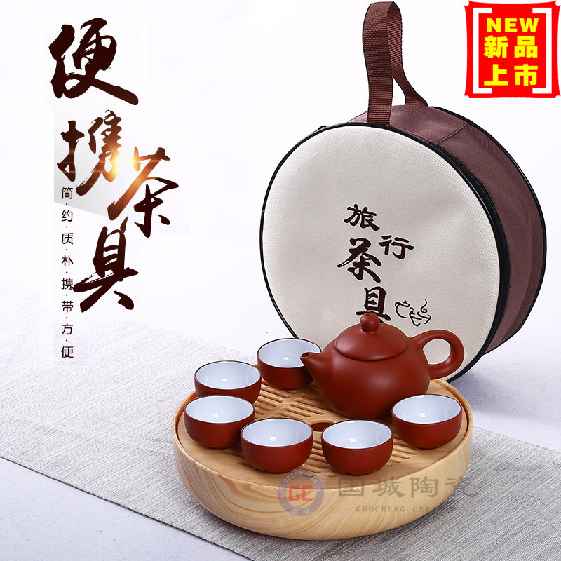 屋外で小型の紫砂潮汕カンフー茶器を持って野外で旅行している工夫茶茶器セットの携帯バッグ