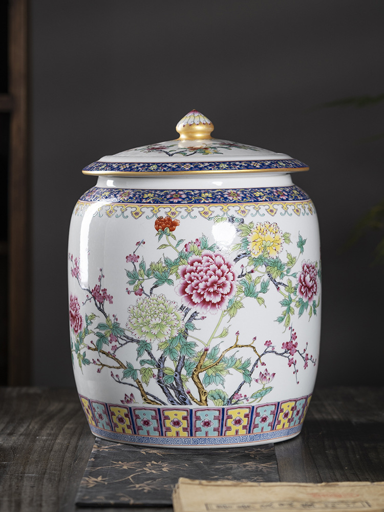 景徳鎮の陶磁器の大口の米のかめの水筒の顔のかめの20斤の家庭用の蓋の米の桶の防湿の防虫のお茶の餅の密封の缶