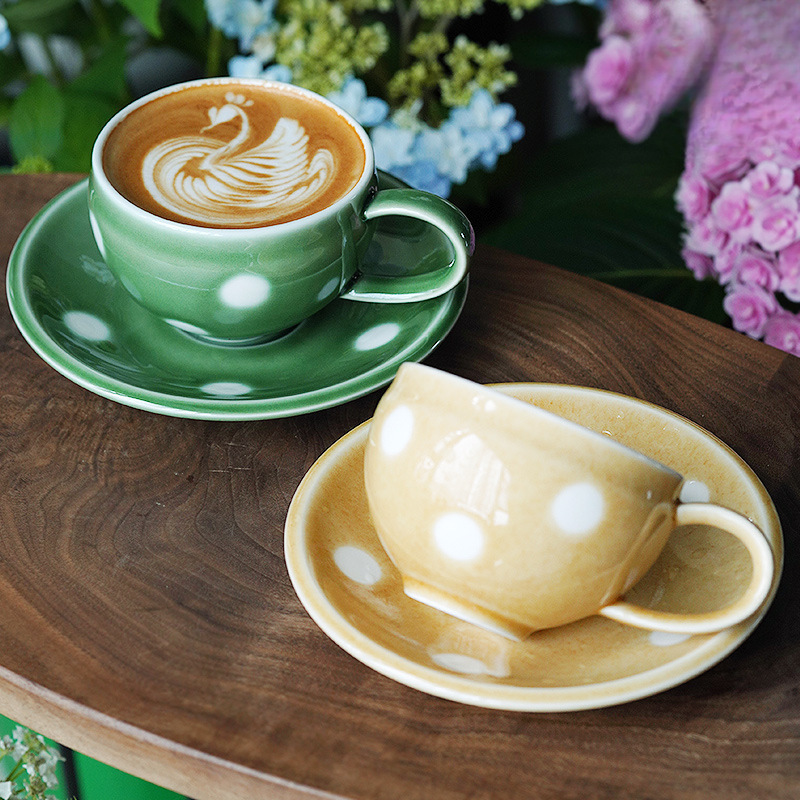 卵カップのコーヒーカップのレトロな陶磁器の波点の釉薬の下でカラーのラテプルカップの下でお茶のコーヒーカップの皿