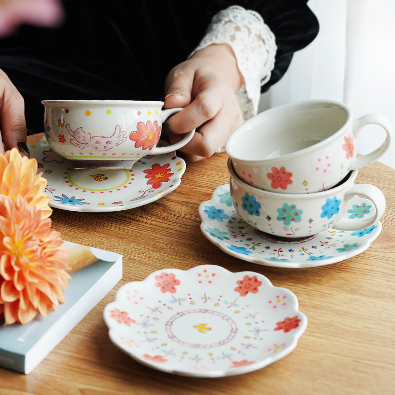 レトロな杯の高い顔のコーヒーの杯の皿の陶磁器の小さい清新な釉薬の下で色の手描きの中古の午後のお茶の杯の皿