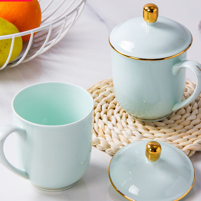 景徳鎮陶磁器カップ蓋付き金辺カップセット家庭用オフィスカップ青磁会議カップカスタムロゴ