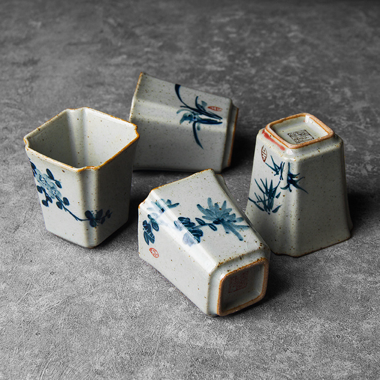 手の粗い陶器のお茶の杯景徳鎮の復古の手描きの青花の品茗杯の中国式の工夫の茶器は香の杯の方の口の杯を聞きます。
