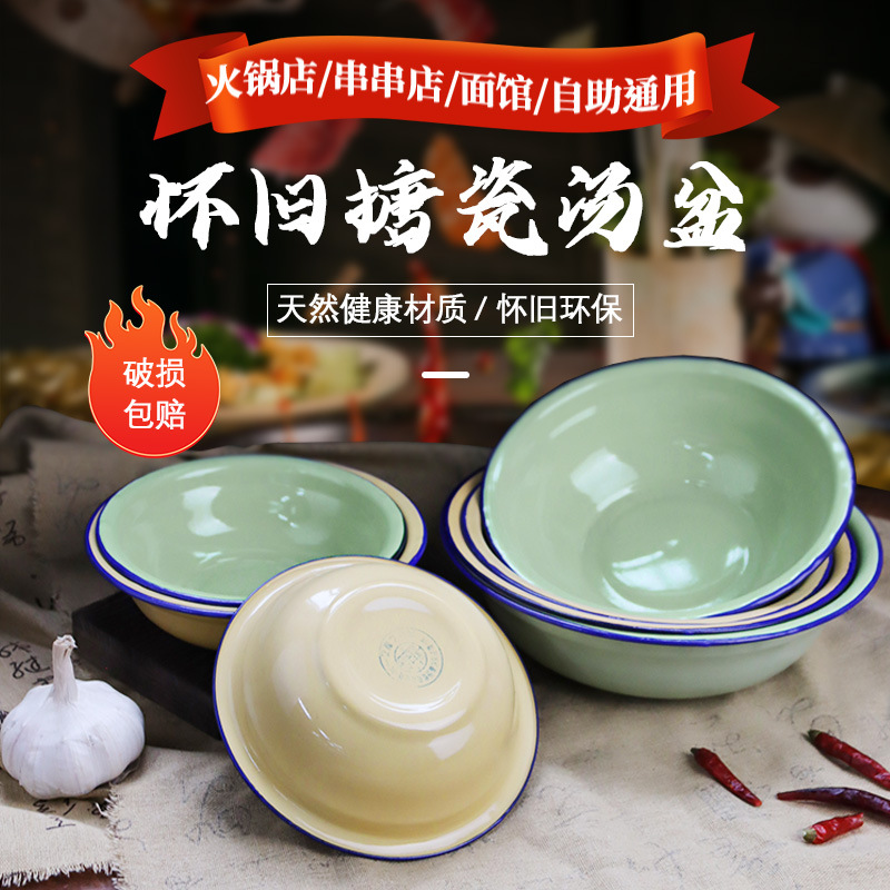 エナメル盆の古いエナメル碗の伝統的なエナメルの碗の商用の小さいスープの碗の黄色の磁器のたらいのレトロなホテルのスープの野菜のたらい
