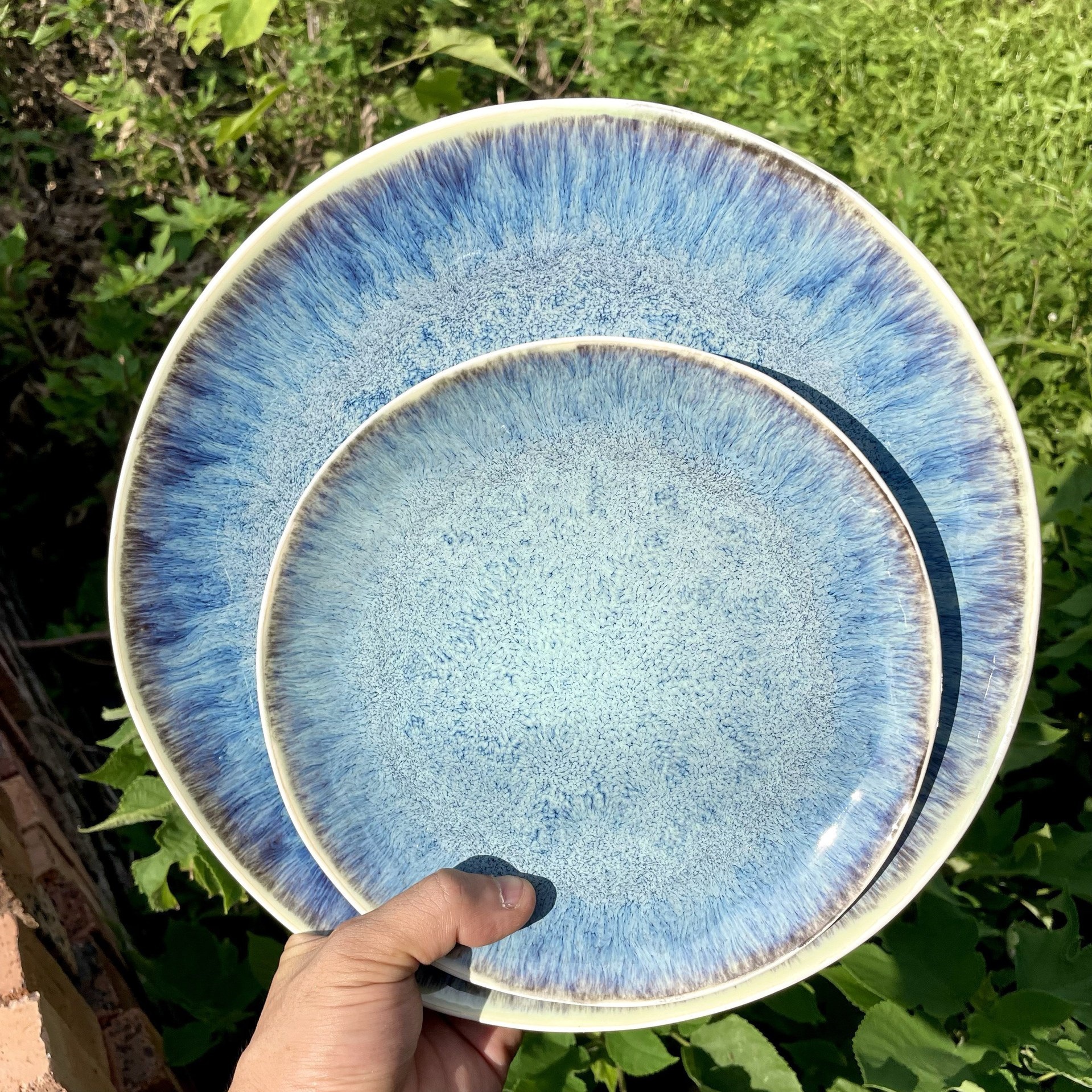 美しいアメリカ式窯が青い粗陶底陶磁器大皿洋食果物サラダ皿家庭用料理皿シンプル皿