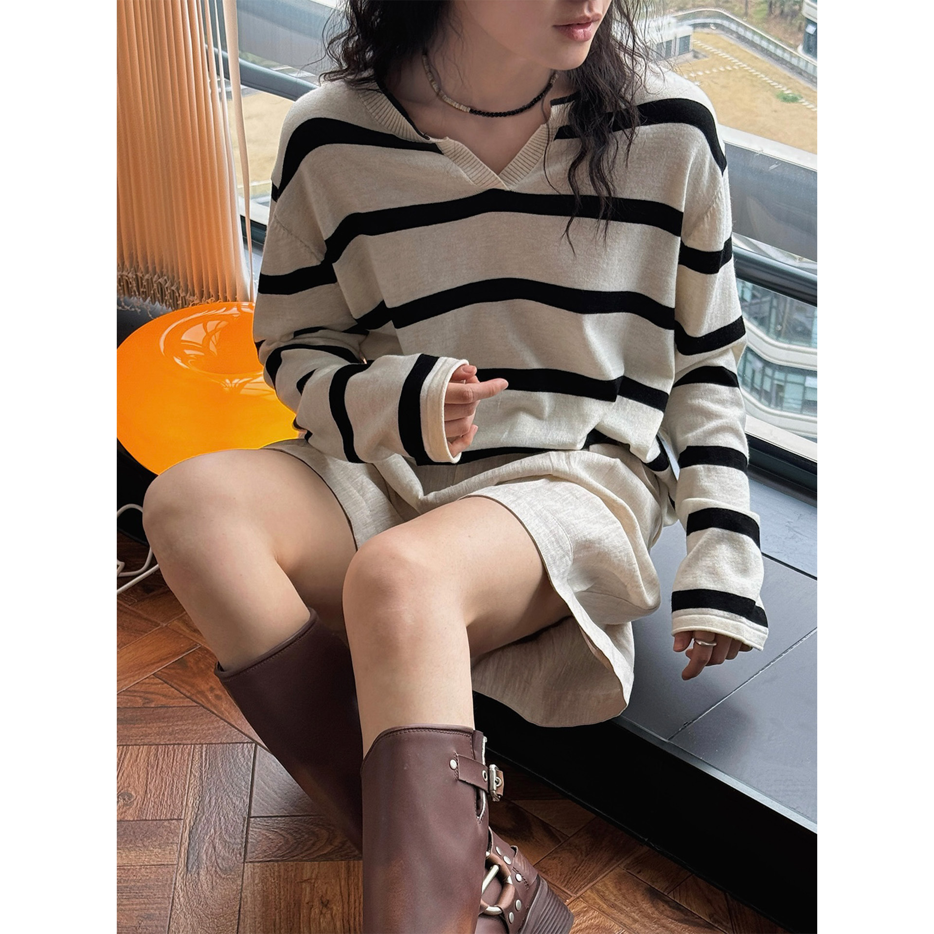 ルーヴル夏の新作韓国系レトロで怠惰なウールのストライプの日焼け止めニットの柔らかいモチモチとした肌がやせて見える上着の女性
