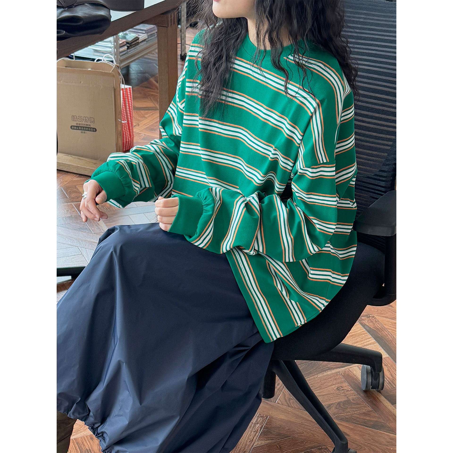 ルーヴル春新作韓国版レトロカラーストライプ長袖tシャツ爽やかで快適なカジュアル上着女性