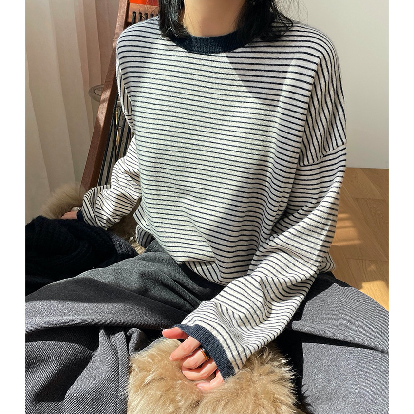冬の新型の韓系の怠惰なレトロなカジュアルなストライプの丸首のセーターはゆったりとしています。
