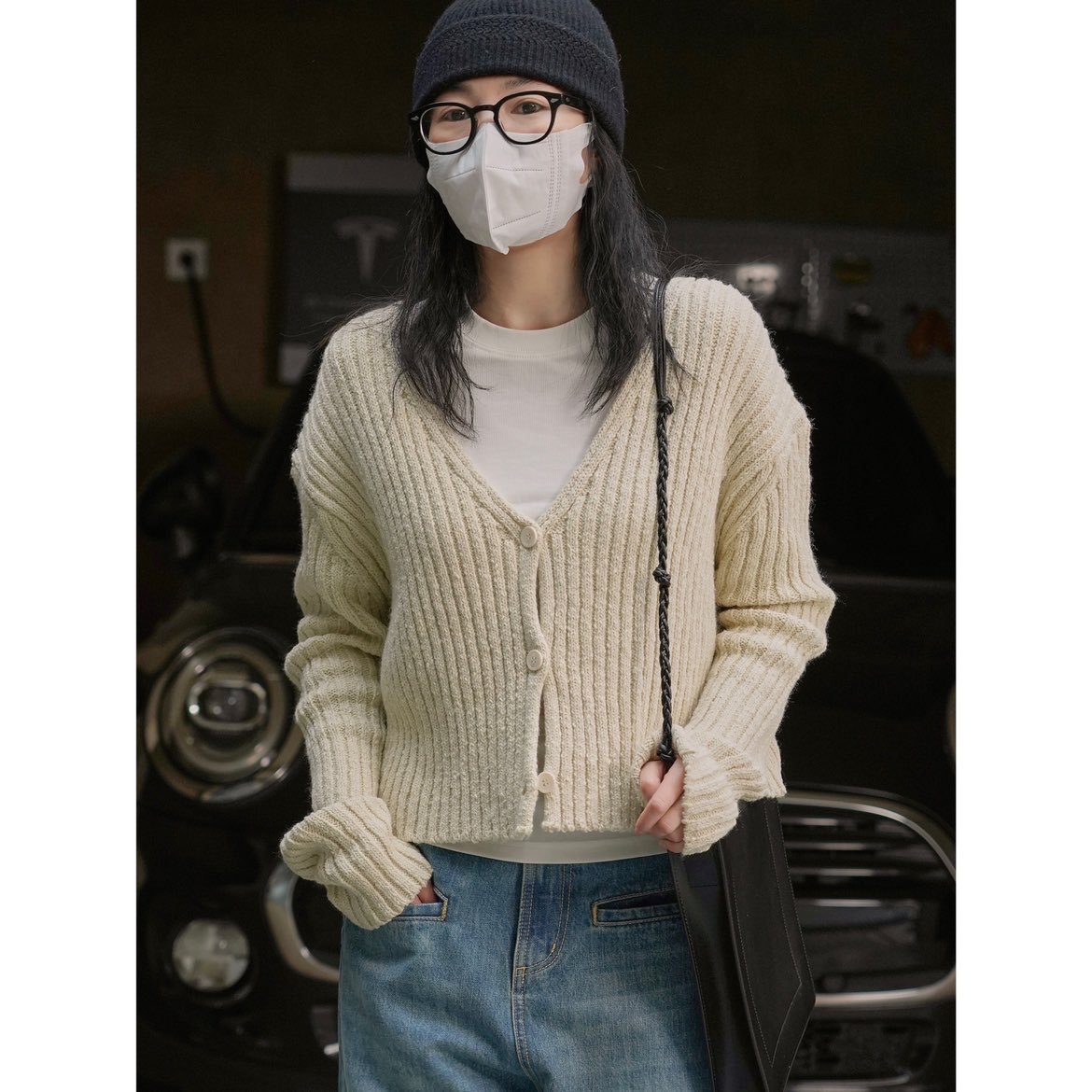 盧浮春の新作韓国版の怠惰でシンプルなvネックのカーディガンがゆったりしていて、筋肉感があります。