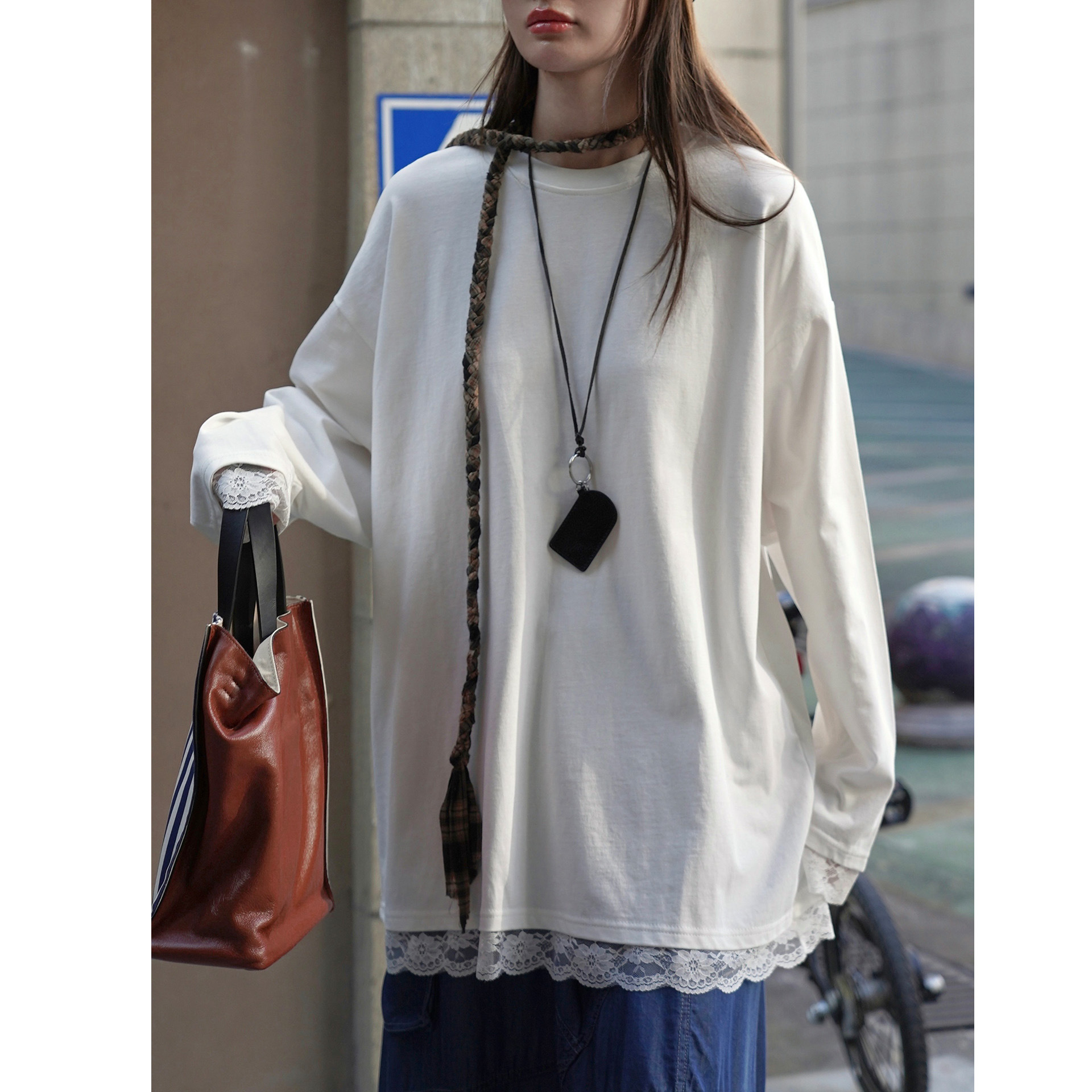 ルーブル初秋の新韓国スタイルシンプルなレース長袖Tシャツベーシックシルエットスリムカジュアルトップ女性用