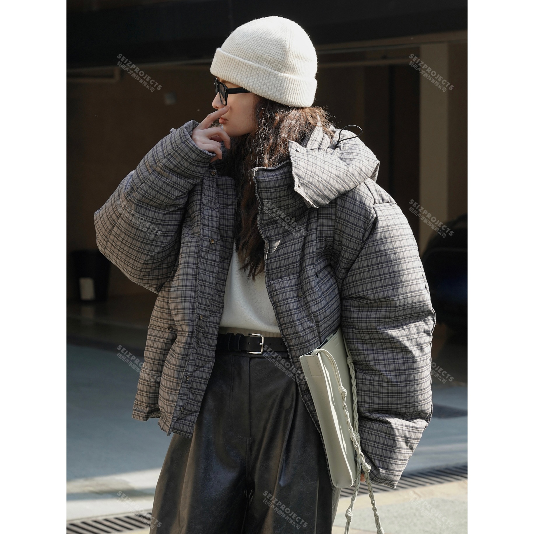 ルーファー冬の新作韓国風デザインチェック柄取り外し可能な帽子付きダウンジャケット暖かいコート女性用