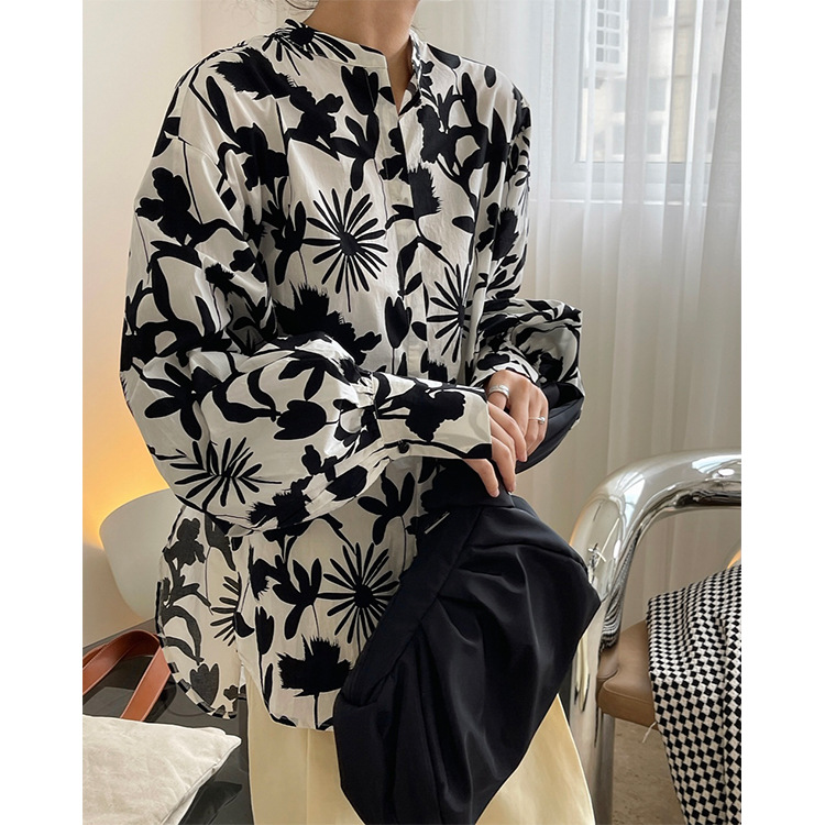 早秋の新型フランス文芸気質白黒プリント立襟灯籠袖カジュアルシャツがゆったりしていて、着痩せしている上着の女性がいます。