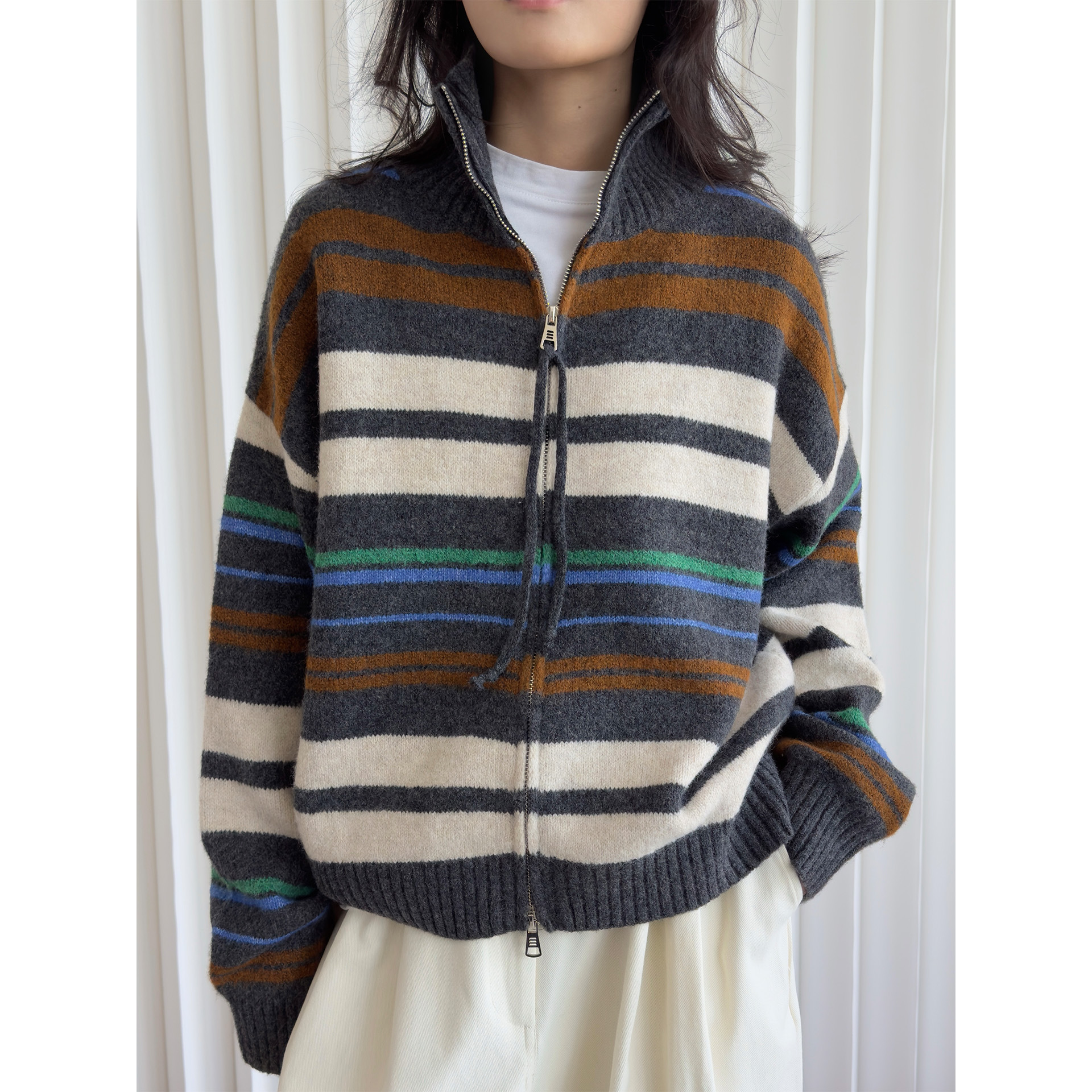 ルーヴル冬の新型韓国版衝突色ストライプ立襟綿ウールセーターのカーディガンの柔らかいモチモチの肌に優しい上着の女性