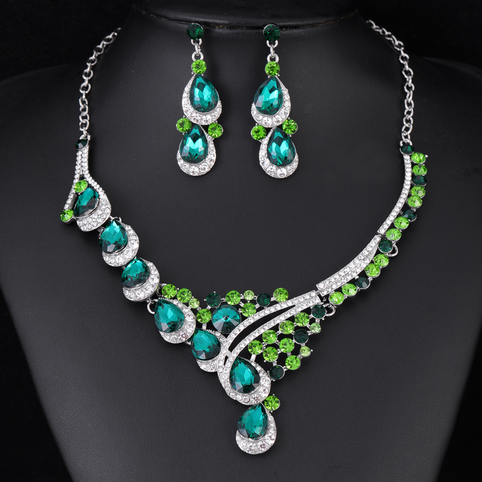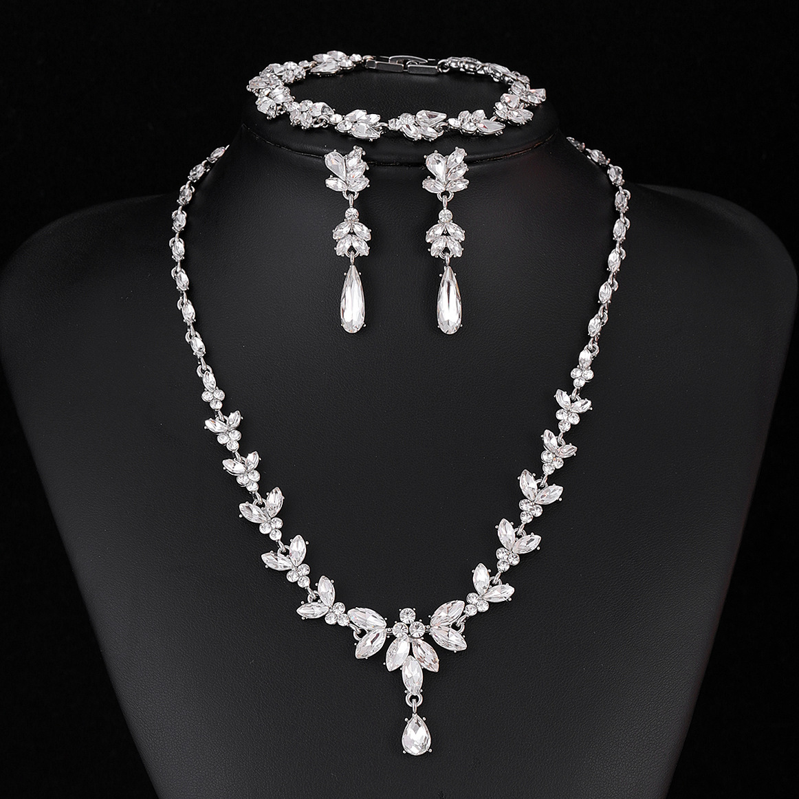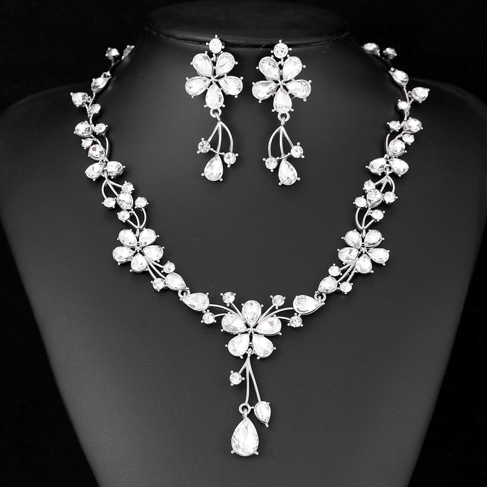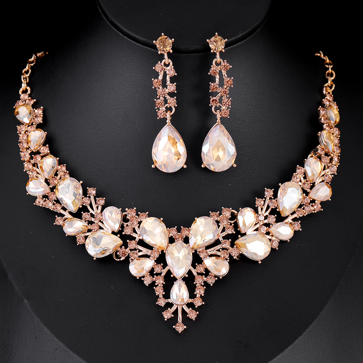 跨境亚马逊项链批发水滴水晶新娘满钻配饰项链耳环婚纱礼服二件套