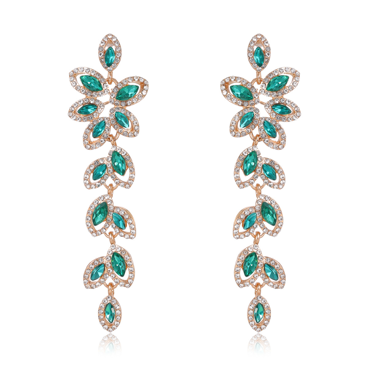 欧美新款时尚水滴合金耳环女 耳饰长款树叶流苏奢华闪耀水钻耳钉