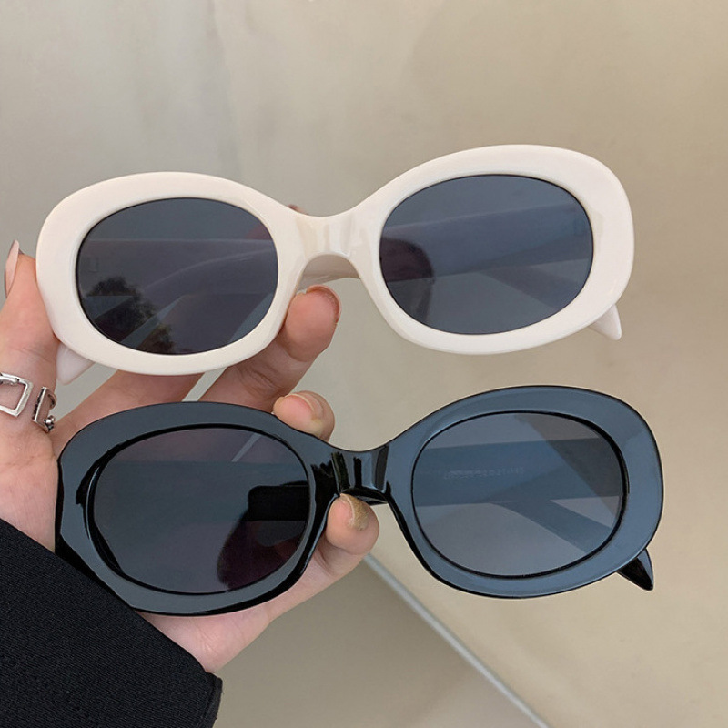欧米の個性的な楕円のサングラスの女性の夏の百合の復古の潮流の街は夏に車を運転して海辺の日焼け止めのサングラスを撮影します。