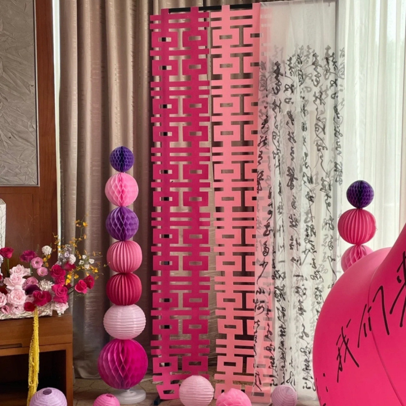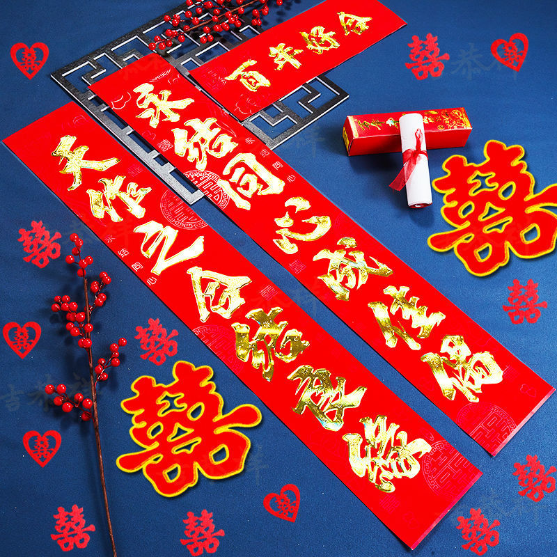 結婚対聯のおめでたい男性の結婚部屋に女性の結婚祝い用品の玄関の喜字聯を配置します。