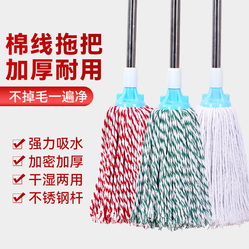 家庭用純綿モップ、昔ながらのユニバーサルフラットワイドヘッドモップ、厚みのある白い糸、色付きの綿糸、水を吸収し、糸くずが出ません。