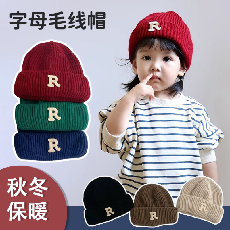 Ins韓国版シンプルアルファベットPマーク赤ちゃんニット毛糸カバーキャップ秋冬赤ちゃん帽子保温瓜皮帽子