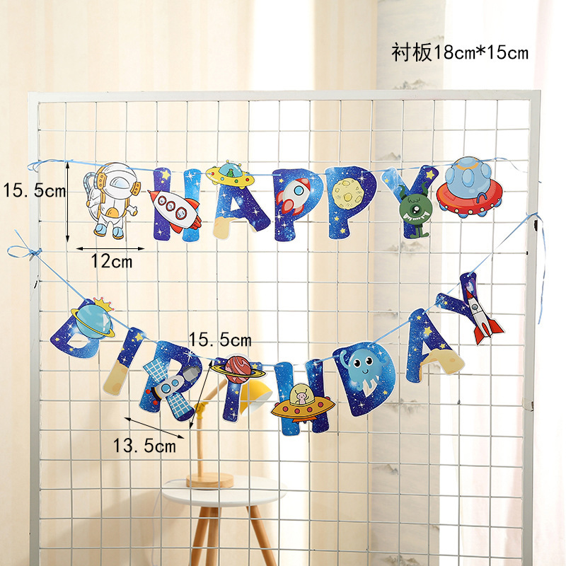 新しい星の誕生日のアルファベットの旗の宇宙船の装飾の花の歳の誕生日の集まりのシーンの装飾の配置