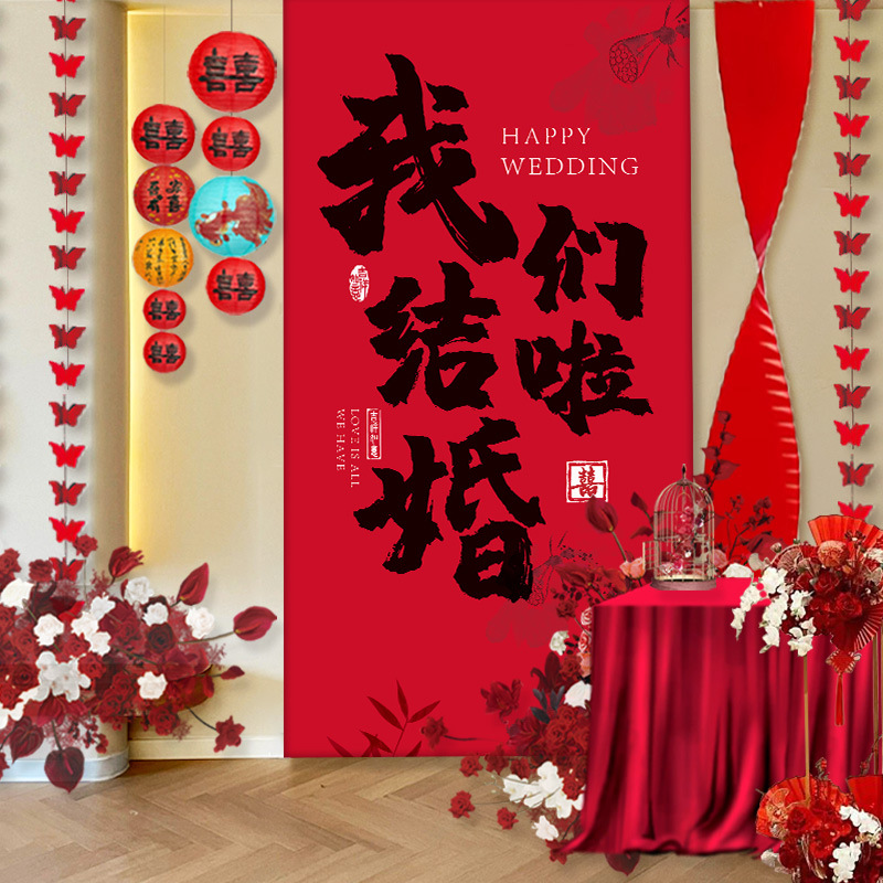 新しい中国式の結婚の客間の背景の壁は双喜の字の条の幅を飾って男性の女性の結婚する部屋の婚約の配置を結びます。