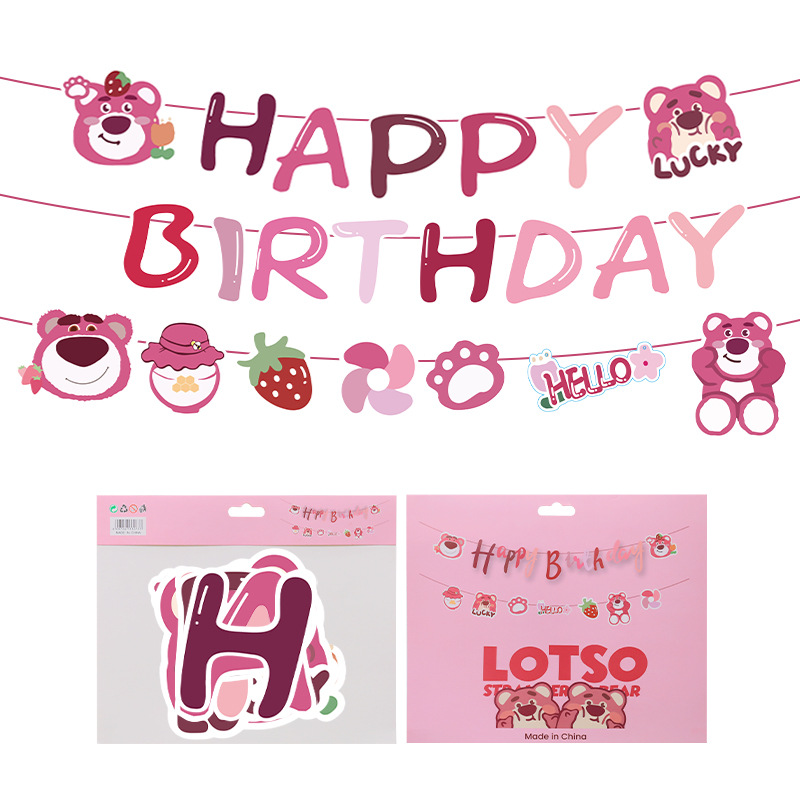 子供の歳の誕生日の漫画のイチゴの熊の誕生日は旗を引っ張ります。