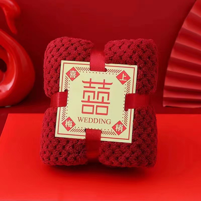 結婚祝いのプレゼントの喜字タオルの赤いタオルの卸売りの婚約の満月の返礼の喜字タオルのサンゴの絨毯