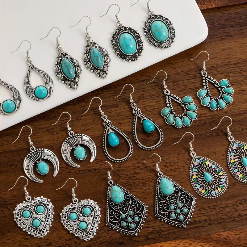 緑松石イヤリング新型欧米クロスボーダー合金幾何学イヤリング女性民族風緑松石ファッション質感耳飾り