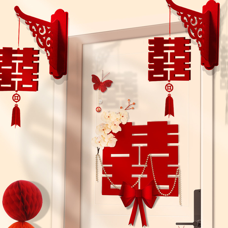 結婚部屋に結婚喜字シールを配置している女性の寝室に新しい部屋を飾っているドアには、結婚式の準備品がついている