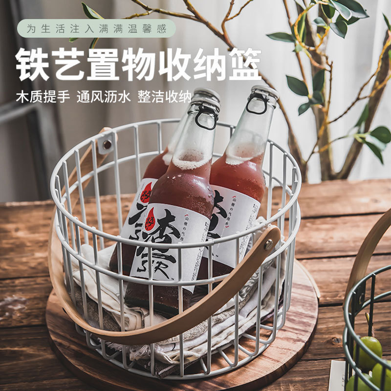 国境を越えた北欧の創造的な果物収納バスケットキッチン木柄鉄製バスケットリビングルームのスナック飲料雑物収納バスケット