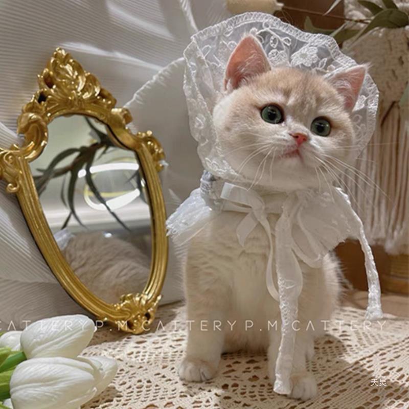 猫のレースのウェディングドレスのお姫様セット帽子のマフラーのお腹を囲んで写真を撮ります。