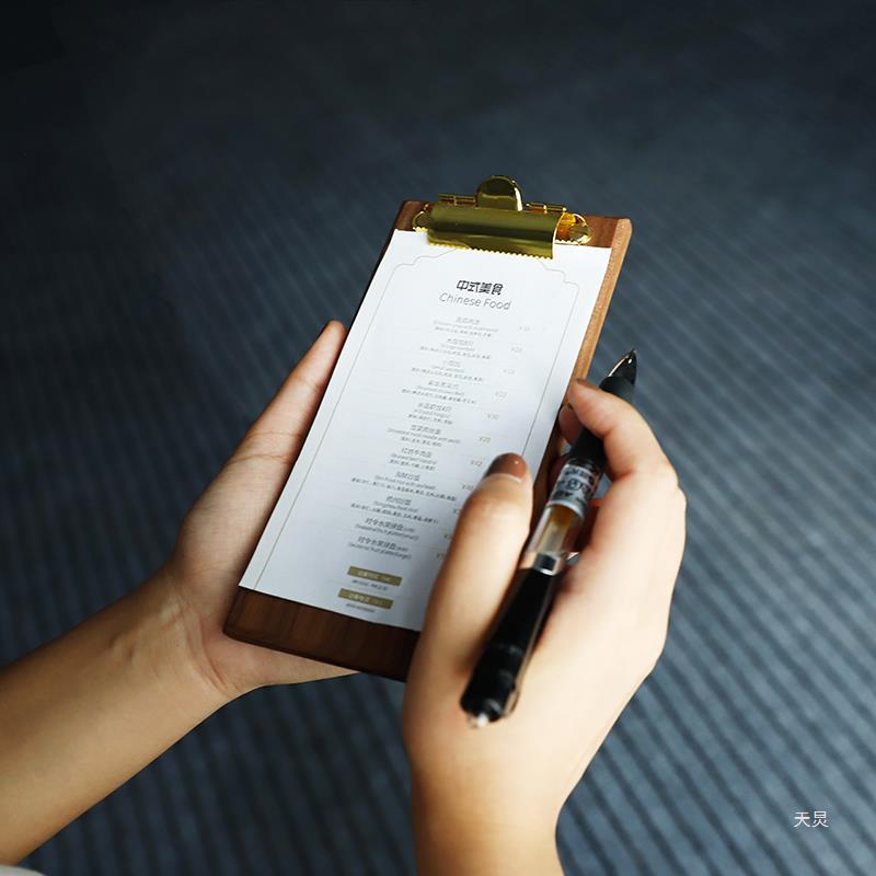 胡桃の木のメニューは請求書を挟んで板を挟んで字を書きます。