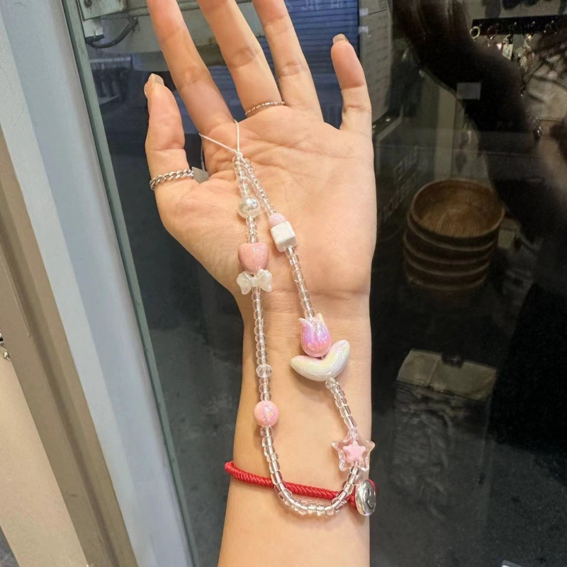 ins クリエイティブヘッドフォンカバーストラップピンク手作りビーズチェーン携帯電話落下防止アクセサリー携帯電話チェーン