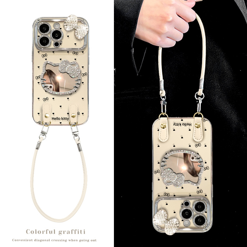 Kt 猫ミラーストラップ Apple 16 携帯電話ケース 13promax 電気メッキ大型ウィンドウ 15 ハイエンド 14 シリコーンに適しています