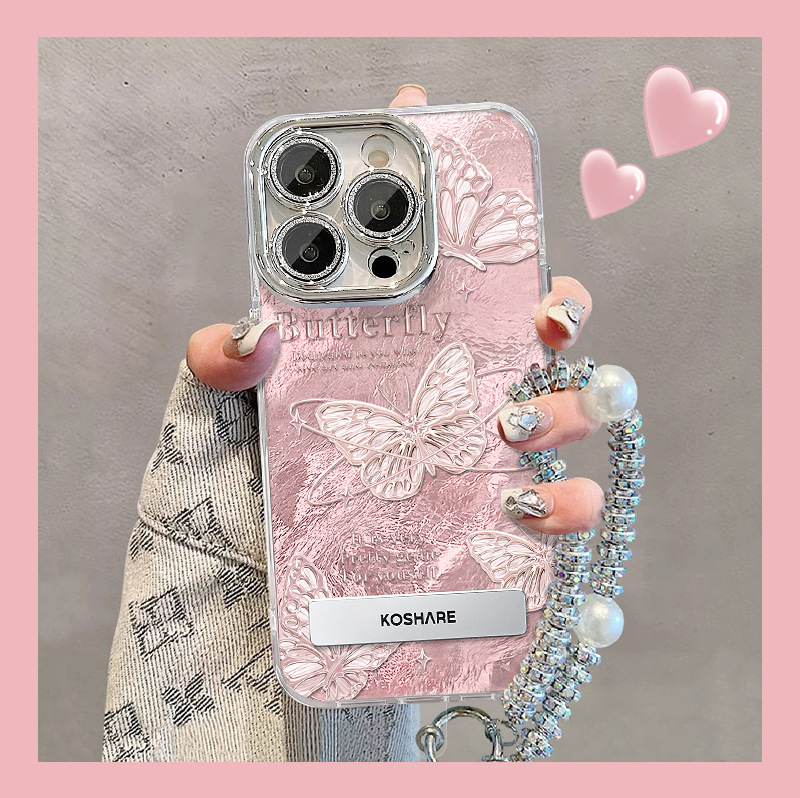 美しいピンクの蝶の支柱のチェーンはリンゴの15錫の紙の紋様の携帯電話の携帯電話の箱の14proのレンズの膜の13を適用してXを落とさないでください。