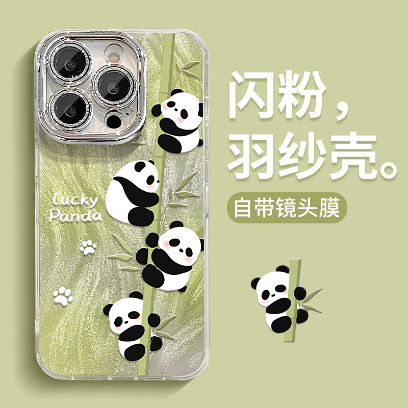 かわいい緑竹パンダ柄のiPhone 16 Pro Max用スマホケース、15羽纱レンズフィルム、14スタンド、17保護カバー