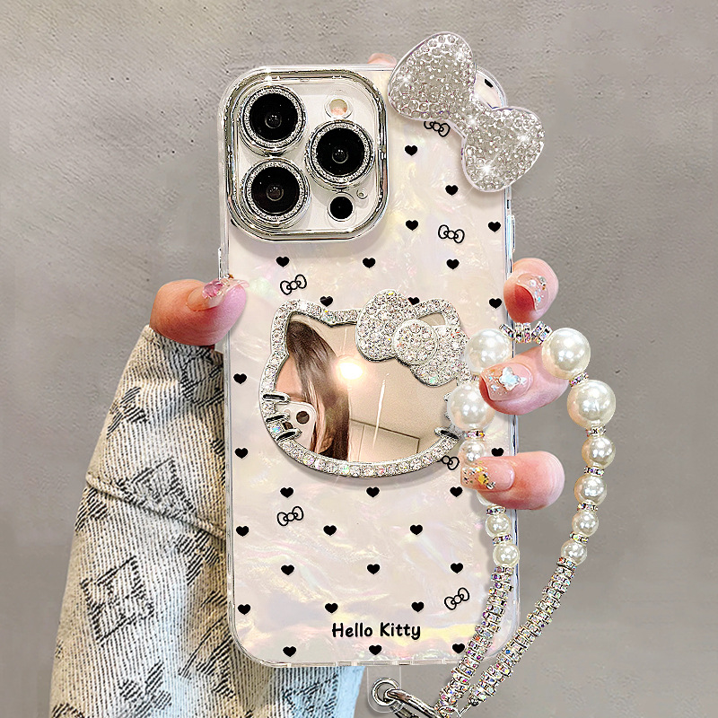 キラキラ輝くKT猫ミラーブレスレット付きiPhoneケース(16Pro、15、14対応)、立体的な蝶結び、キュートな漫画風(17対応)